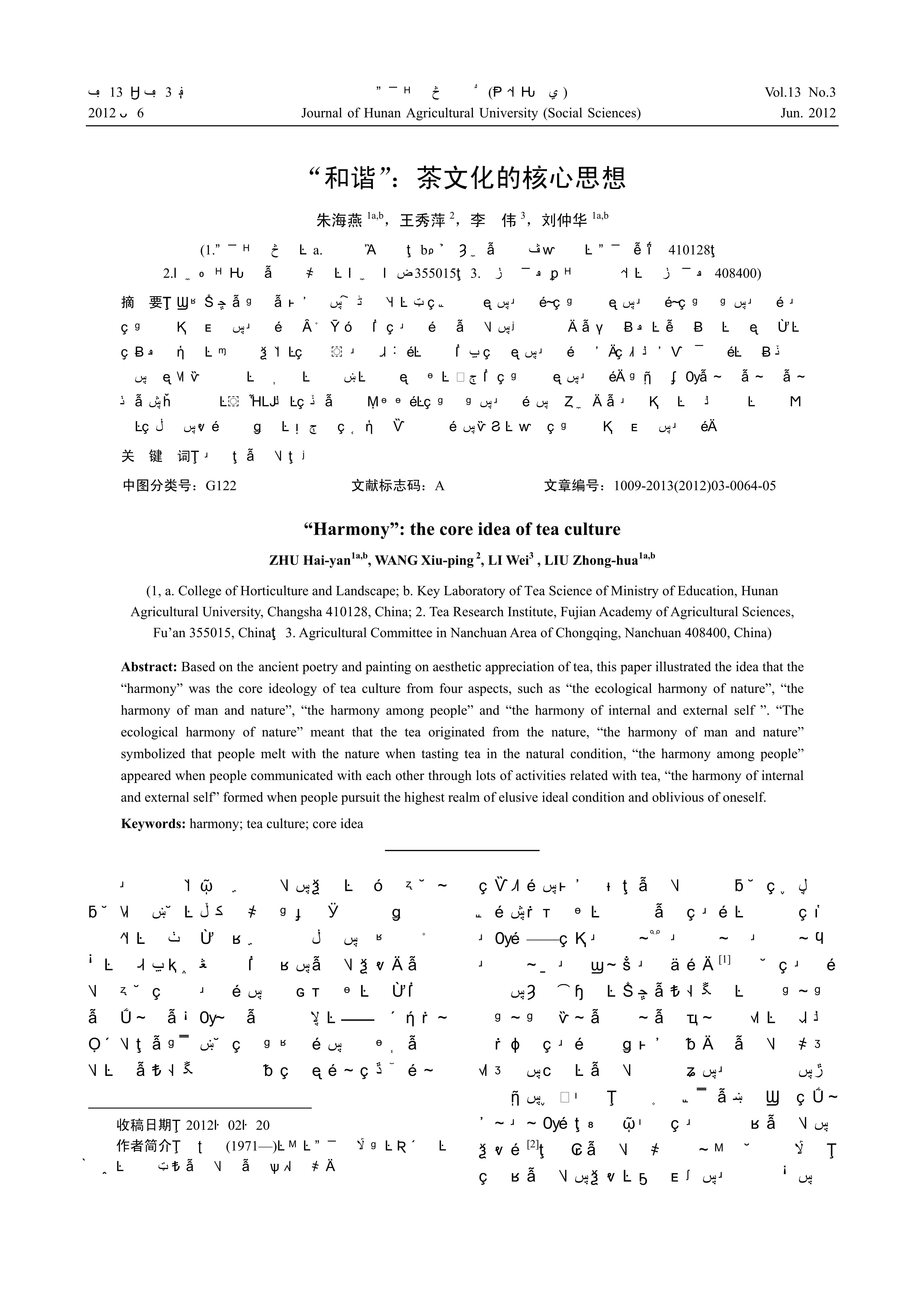 结合历代茶人在茶审美中的诗词书画,从“生态自然的和谐”、“人与自然的和谐”、“人与人的和谐”和“人自我身心内外的和谐”四个方面论述了“和谐”是茶文化的核心思想。茶出自山川,长于山野,天然自成,聚山川之灵秀,日月之精华,“阴阳交和孕嘉木”,体现了其“自然的和谐”之美。“寄情美景与佳茗”,在山清水秀的自然环境中品茗,意入心,心悟道,与自然相融,表达了“人与自然的和谐”。人们通过敬茶、献茶、赠茶、赐茶等沟通思想,交流感情,“清茶一盏乐融融”,“人与人的和谐”得以构建。茶和谐身心,怡情悦意,释矜平燥,“独品得神”尤显高雅,能达致“空灵虚静物我忘”的境界,实现“人自我身心内外的和谐”。