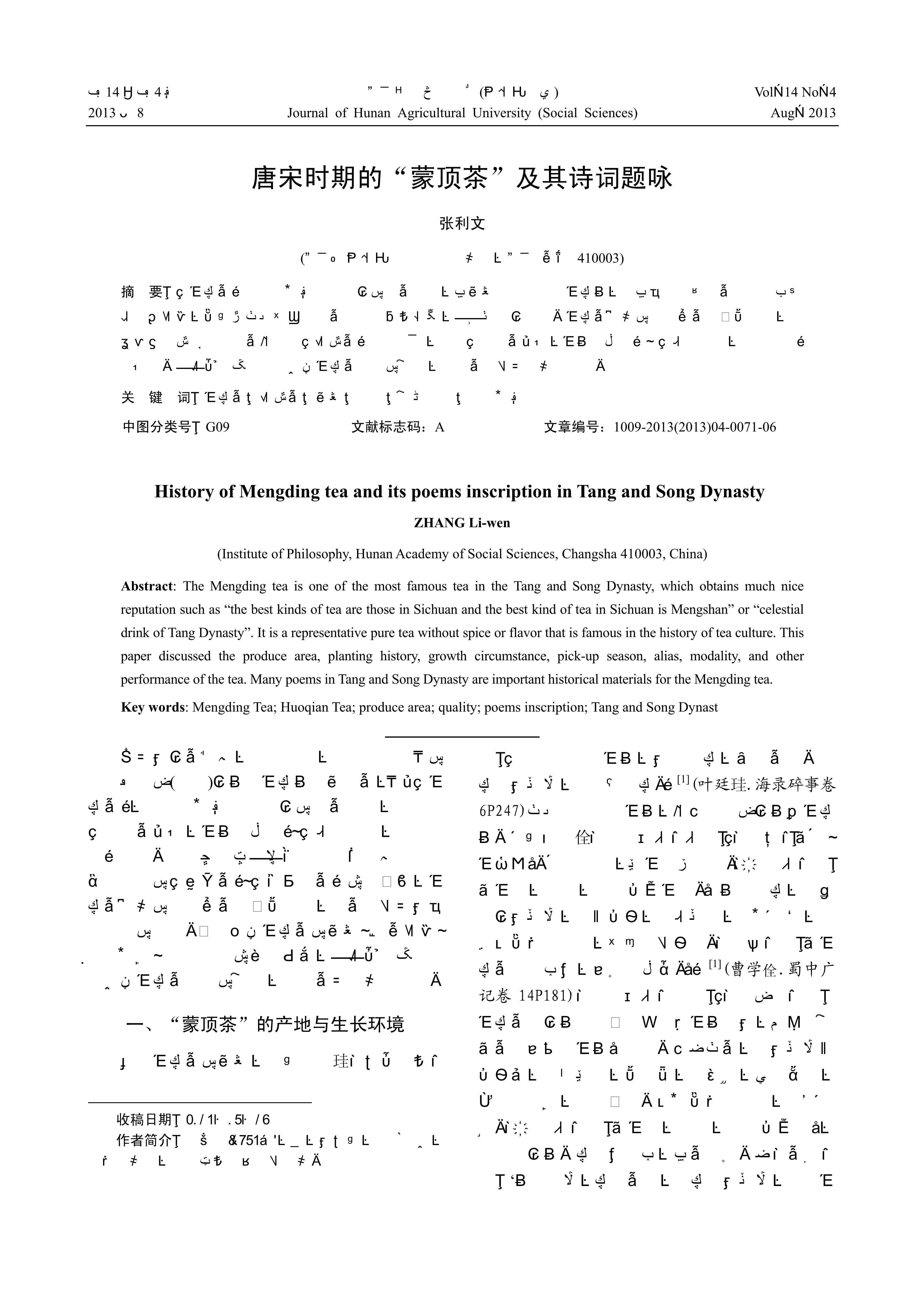 “蒙顶茶”为唐宋时期最为著名的茗茶之一,其产地在蜀之雅州蒙顶山,因其具有适合种茶之特殊气候及土壤环境,僧人到此处后结庵种茶以用于佛事活动,并渐次闻名天下。蒙顶茶讲究的是品尝茶之本色品味,以寒食节之前所采造之茶即所谓“火前茶”品质最佳,享有“蜀土茶称盛,蒙山味独珍”、“极重于唐,以为仙品”之盛誉。并辑录部分唐宋文士对蒙顶茶题咏的诗作,以作茶文化史研究之佐证。