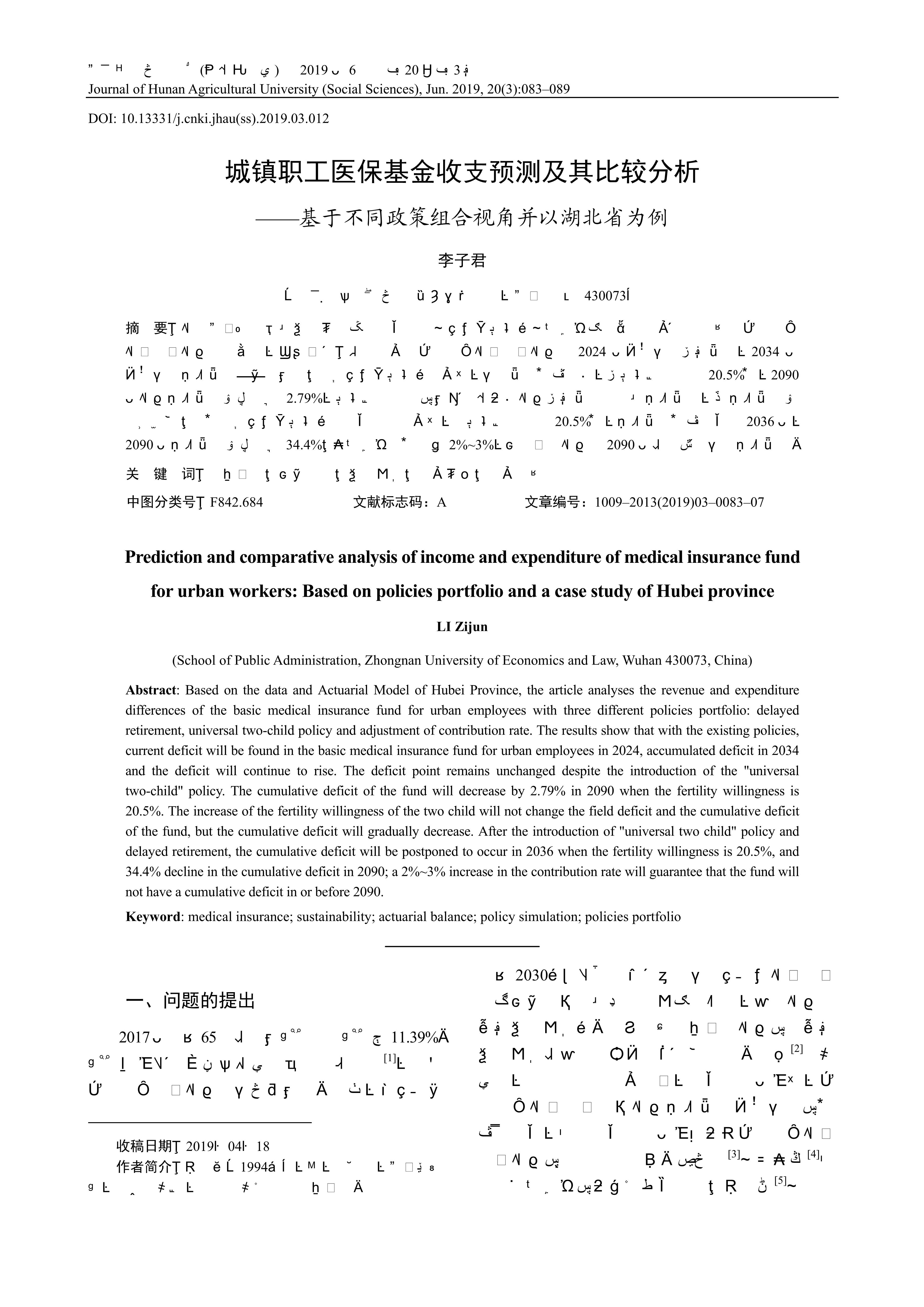 基于湖北省数据和精算模型分析延迟退休、“全面二孩”、缴费率调整三种政策不同组合下城镇职工基本医保基金收支差异,结果表明:既有政策下城镇职工基本医保基金在2024年开始出现当期赤字,2034年开始出现累计赤字并持续上涨;引入“全面二孩”政策后,出现赤字时点不变,当二孩生育意愿20.5%时,2090年基金累计赤字额度下降2.79%,二孩生育意愿的上升不会改变基金当期赤字野战和累计赤字,但累计赤字额逐渐减少;同时引入“全面二孩”与延迟退休政策后,在二孩生育意愿20.5%时,累计赤字时点推迟至2036年,2090年累计赤字额度下降34.4%;若缴费率同时提高2%~3%,可以保证基金在2090年及以前不出现累计赤字。