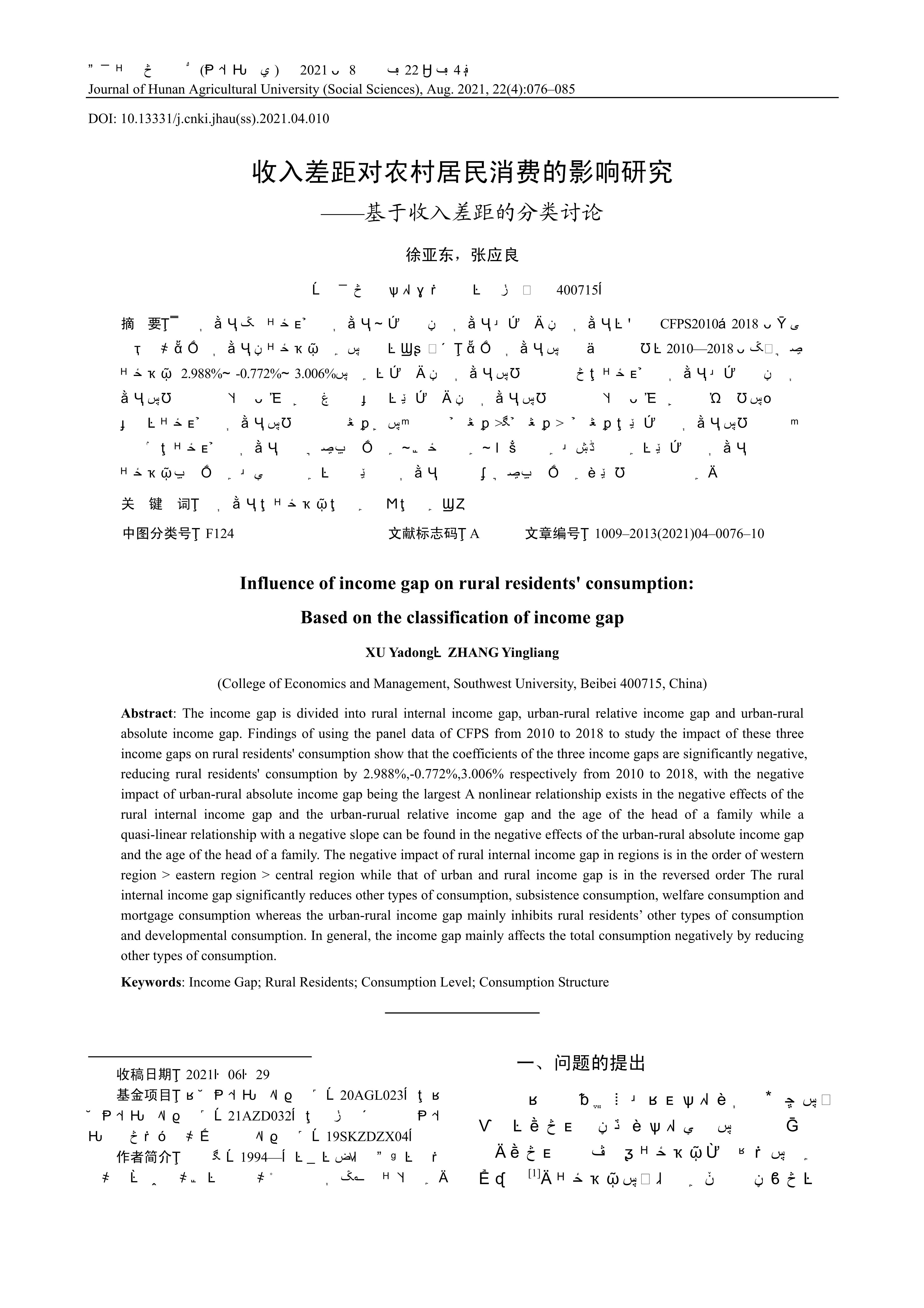 The income gap is divided into rural internal income gap, urban-rural relative income gap and urban-rural absolute income gap. Findings of using the panel data of CFPS from 2010 to 2018 to study the impact of these three income gaps on rural residents' consumption show that the coefficients of the three income gaps are significantly negative, reducing rural residents' consumption by 2.988%,-0.772%,3.006% respectively from 2010 to 2018, with the negative impact of urban-rural absolute income gap being the largest A nonlinear relationship exists in the negative effects of the rural internal income gap and the urban-rurual relative income gap and the age of the head of a family while a quasi-linear relationship with a negative slope can be found in the negative effects of the urban-rural absolute income gap and the age of the head of a family. The negative impact of rural internal income gap in regions is in the order of western region > eastern region > central region while that of urban and rural income gap is in the reversed order The rural internal income gap significantly reduces other types of consumption, subsistence consumption, welfare consumption and mortgage consumption whereas the urban-rural income gap mainly inhibits rural residents’ other types of consumption and developmental consumption. In general, the income gap mainly affects the total consumption negatively by reducing other types of consumption.