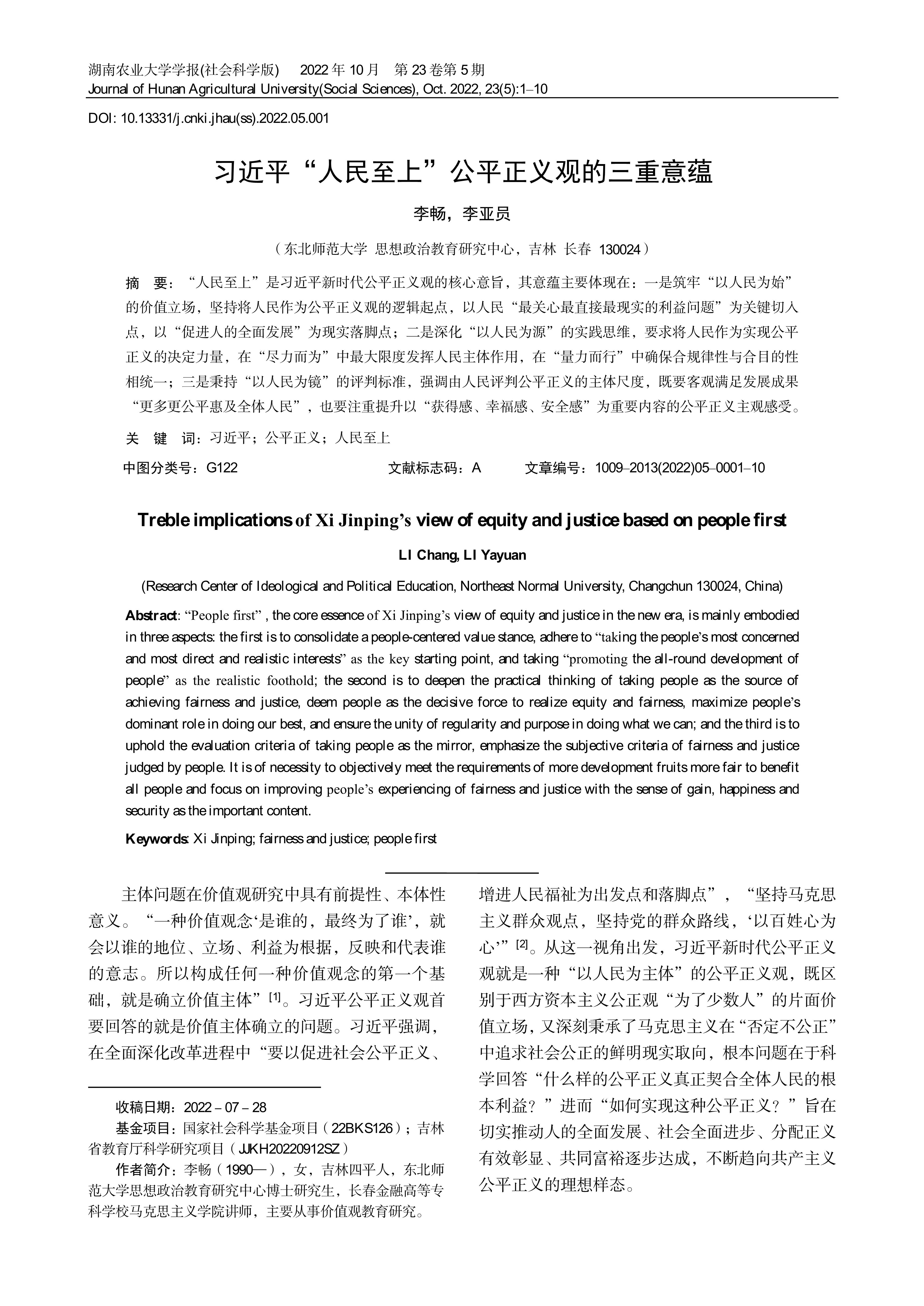 “People first” , the core essence of Xi Jinping’s view of equity and justice in the new era, is mainly embodied in three aspects: the first is to consolidate a people-centered value stance, adhere to “taking the people’s most concerned and most direct and realistic interests” as the key starting point, and taking “promoting the all-round development of people” as the realistic foothold; the second is to deepen the practical thinking of taking people as the source of achieving fairness and justice, deem people as the decisive force to realize equity and fairness, maximize people’s dominant role in doing our best, and ensure the unity of regularity and purpose in doing what we can; and the third is to uphold the evaluation criteria of taking people as the mirror, emphasize the subjective criteria of fairness and justice judged by people.It is of necessity to objectively meet the requirements of more development fruits more fair to benefit all people and focus on improving people’s experiencing of fairness and justice with the sense of gain, happiness and security as the important content.