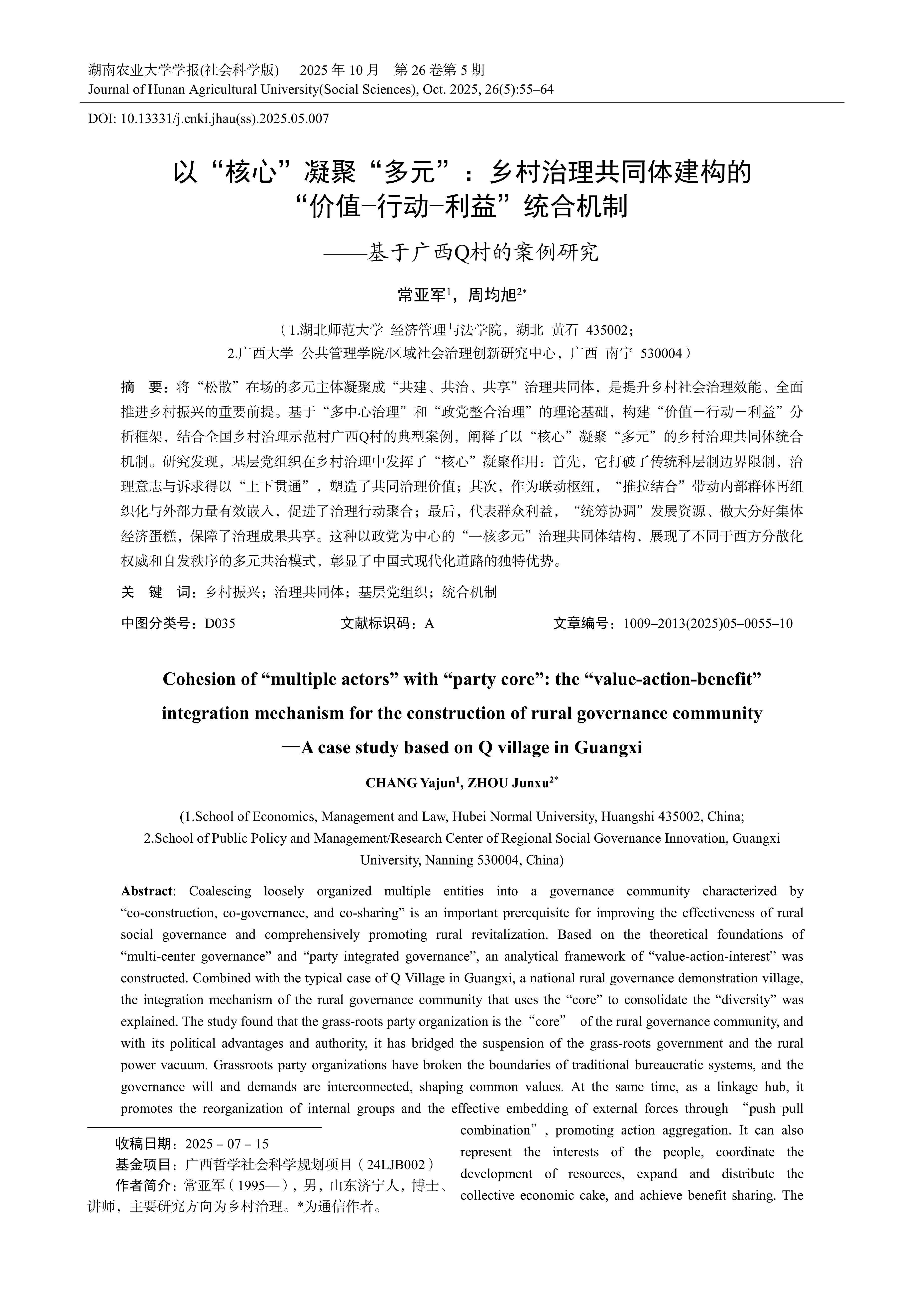 以“核心”凝聚“多元”:乡村治理共同体建构的“价值−行动−利益”统合机制——基于广西Q村的案例研究