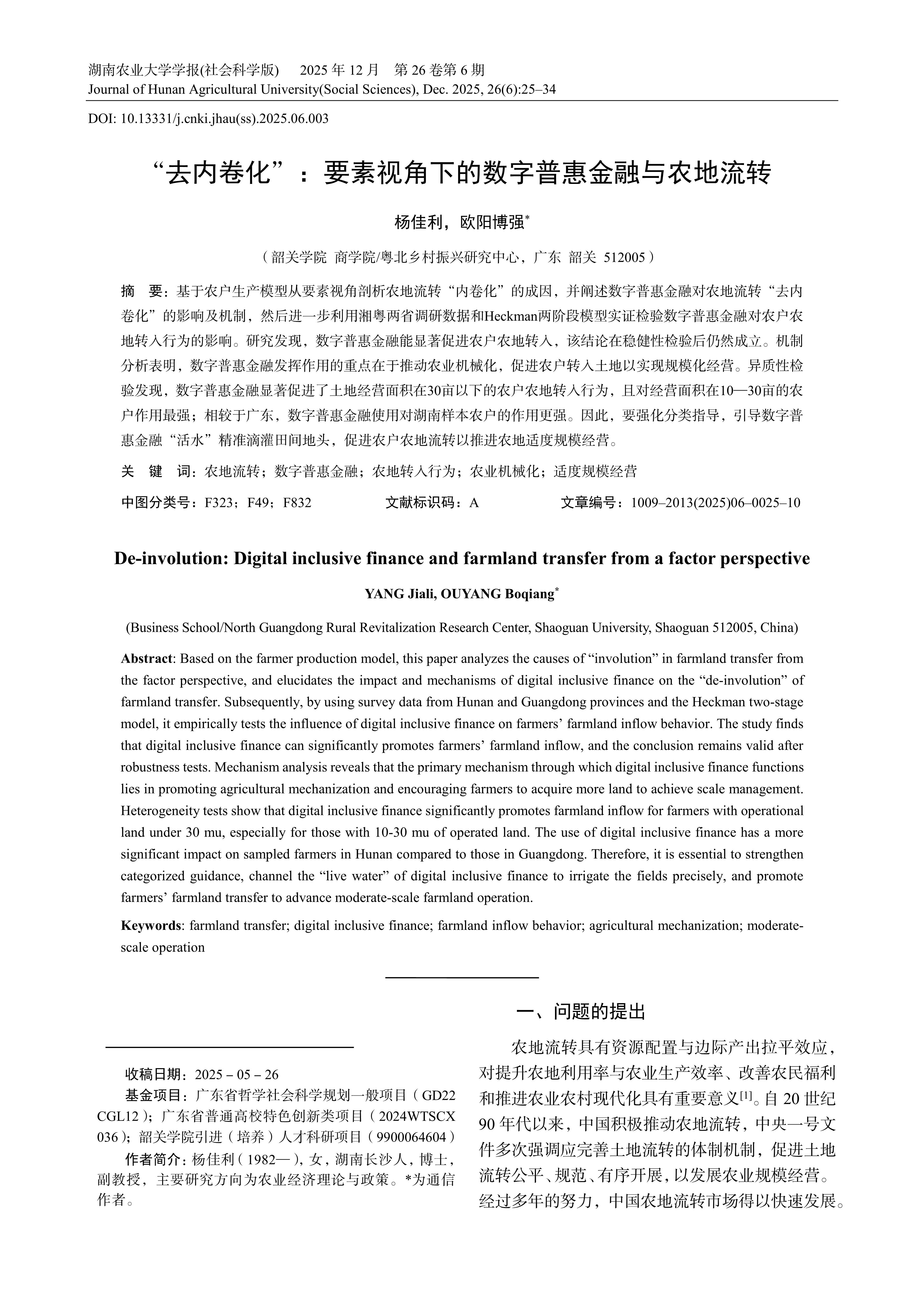 Based on the farmer production model, this paper analyzes the causes of “involution” in farmland transfer from the factor perspective, and elucidates the impact and mechanisms of digital inclusive finance on the “de-involution” of farmland transfer. Subsequently, by using survey data from Hunan and Guangdong provinces and the Heckman two-stage model, it empirically tests the influence of digital inclusive finance on farmers’ farmland inflow behavior. The study finds that digital inclusive finance can significantly promotes farmers’ farmland inflow, and the conclusion remains valid after robustness tests. Mechanism analysis reveals that the primary mechanism through which digital inclusive finance functions lies in promoting agricultural mechanization and encouraging farmers to acquire more land to achieve scale management. Heterogeneity tests show that digital inclusive finance significantly promotes farmland inflow for farmers with operational land under 30 mu, especially for those with 10-30 mu of operated land. The use of digital inclusive finance has a more significant impact on sampled farmers in Hunan compared to those in Guangdong. Therefore, it is essential to strengthen categorized guidance, channel the “live water” of digital inclusive finance to irrigate the fields precisely, and promote farmers’ farmland transfer to advance moderate-scale farmland operation.