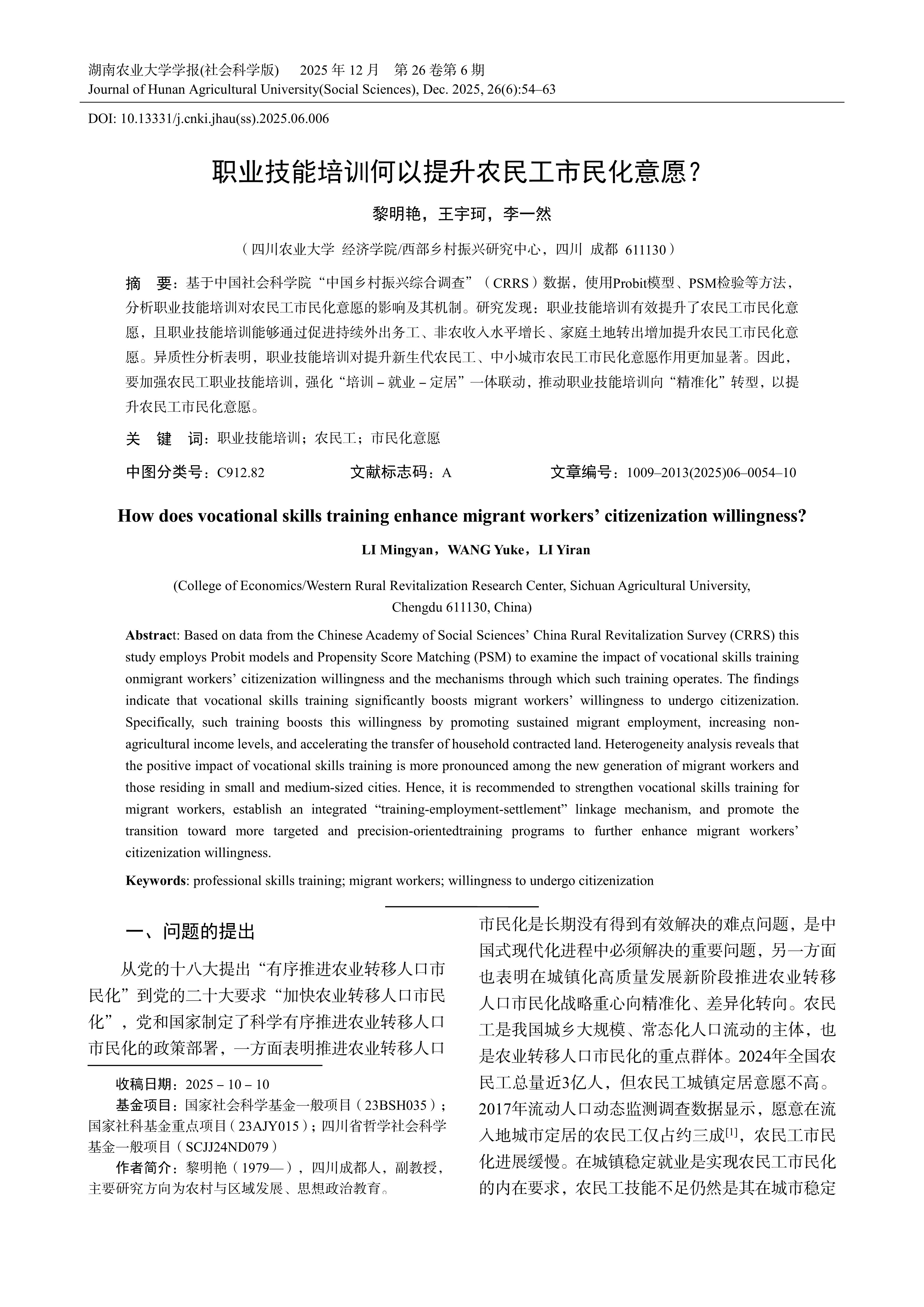 Based on data from the Chinese Academy of Social Sciences’ China Rural Revitalization Survey (CRRS) this study employs Probit models and Propensity Score Matching (PSM) to examine the impact of vocational skills training onmigrant workers’ citizenization willingness and the mechanisms through which such training operates. The findings indicate that vocational skills training significantly boosts migrant workers’ willingness to undergo citizenization. Specifically, such training boosts this willingness by promoting sustained migrant employment, increasing non-agricultural income levels, and accelerating the transfer of household contracted land. Heterogeneity analysis reveals that the positive impact of vocational skills training is more pronounced among the new generation of migrant workers and those residing in small and medium-sized cities. Hence, it is recommended to strengthen vocational skills training for migrant workers, establish an integrated “training-employment-settlement” linkage mechanism, and promote the transition toward more targeted and precision-orientedtraining programs to further enhance migrant workers’ citizenization willingness.