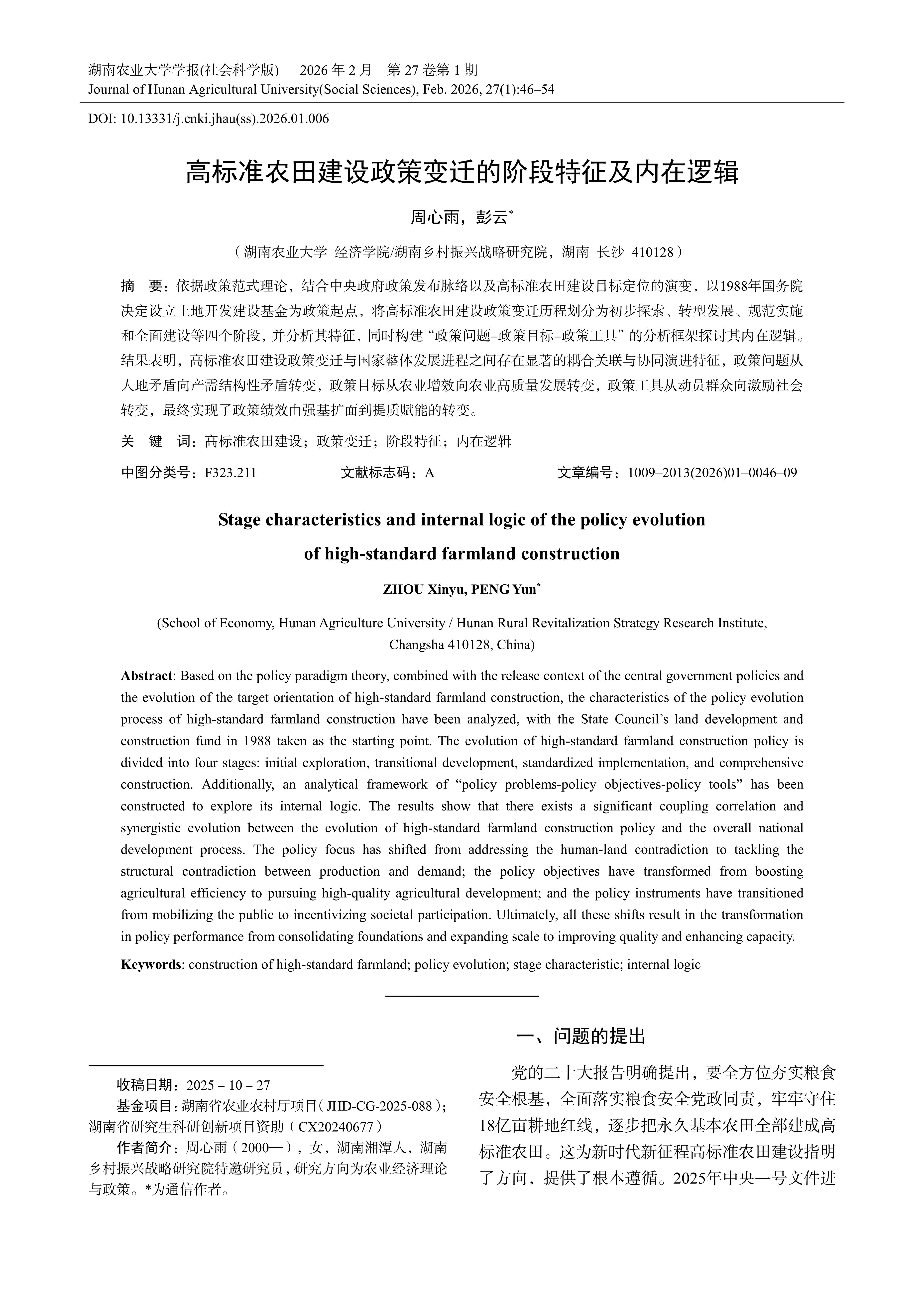 Based on the policy paradigm theory, combined with the release context of the central government policies and the evolution of the target orientation of high-standard farmland construction, the characteristics of the policy evolution process of high-standard farmland construction have been analyzed, with the State Council’s land development and construction fund in 1988 taken as the starting point. The evolution of high-standard farmland construction policy is divided into four stages: initial exploration, transitional development, standardized implementation, and comprehensive construction. Additionally, an analytical framework of “policy problems-policy objectives-policy tools” has been constructed to explore its internal logic. The results show that there exists a significant coupling correlation and synergistic evolution between the evolution of high-standard farmland construction policy and the overall national development process. The policy focus has shifted from addressing the human-land contradiction to tackling the structural contradiction between production and demand; the policy objectives have transformed from boosting agricultural efficiency to pursuing high-quality agricultural development; and the policy instruments have transitioned from mobilizing the public to incentivizing societal participation. Ultimately, all these shifts result in the transformation in policy performance from consolidating foundations and expanding scale to improving quality and enhancing capacity.
