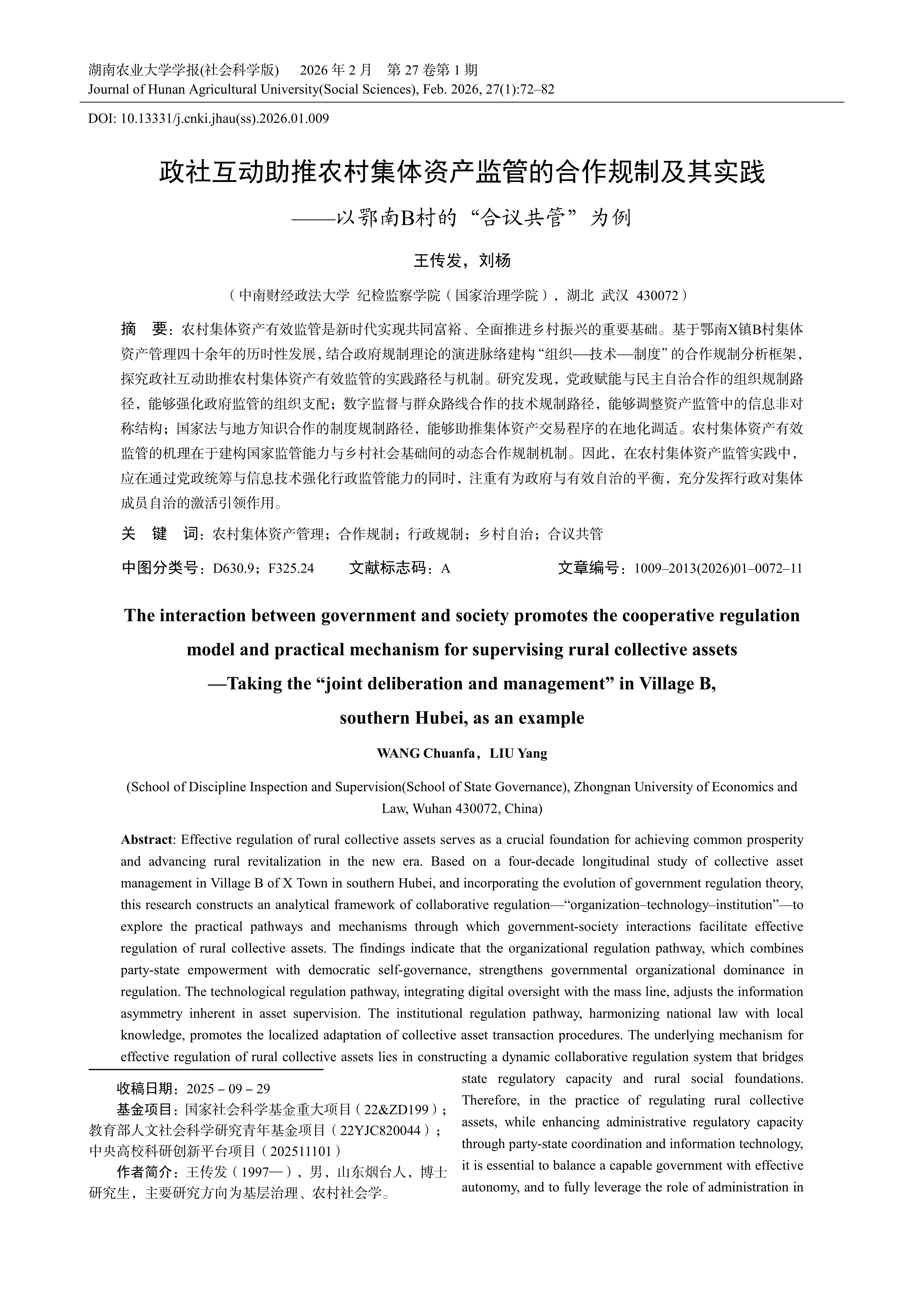 Effective regulation of rural collective assets serves as a crucial foundation for achieving common prosperity and advancing rural revitalization in the new era. Based on a four-decade longitudinal study of collective asset management in Village B of X Town in southern Hubei, and incorporating the evolution of government regulation theory, this research constructs an analytical framework of collaborative regulation—“organization–technology–institution”—to explore the practical pathways and mechanisms through which government-society interactions facilitate effective regulation of rural collective assets. The findings indicate that the organizational regulation pathway, which combines party-state empowerment with democratic self-governance, strengthens governmental organizational dominance in regulation. The technological regulation pathway, integrating digital oversight with the mass line, adjusts the information asymmetry inherent in asset supervision. The institutional regulation pathway, harmonizing national law with local knowledge, promotes the localized adaptation of collective asset transaction procedures. The underlying mechanism for effective regulation of rural collective assets lies in constructing a dynamic collaborative regulation system that bridges state regulatory capacity and rural social foundations. Therefore, in the practice of regulating rural collective assets, while enhancing administrative regulatory capacity through party-state coordination and information technology, it is essential to balance a capable government with effective autonomy, and to fully leverage the role of administration in activating and guiding the self-governance of collective members.