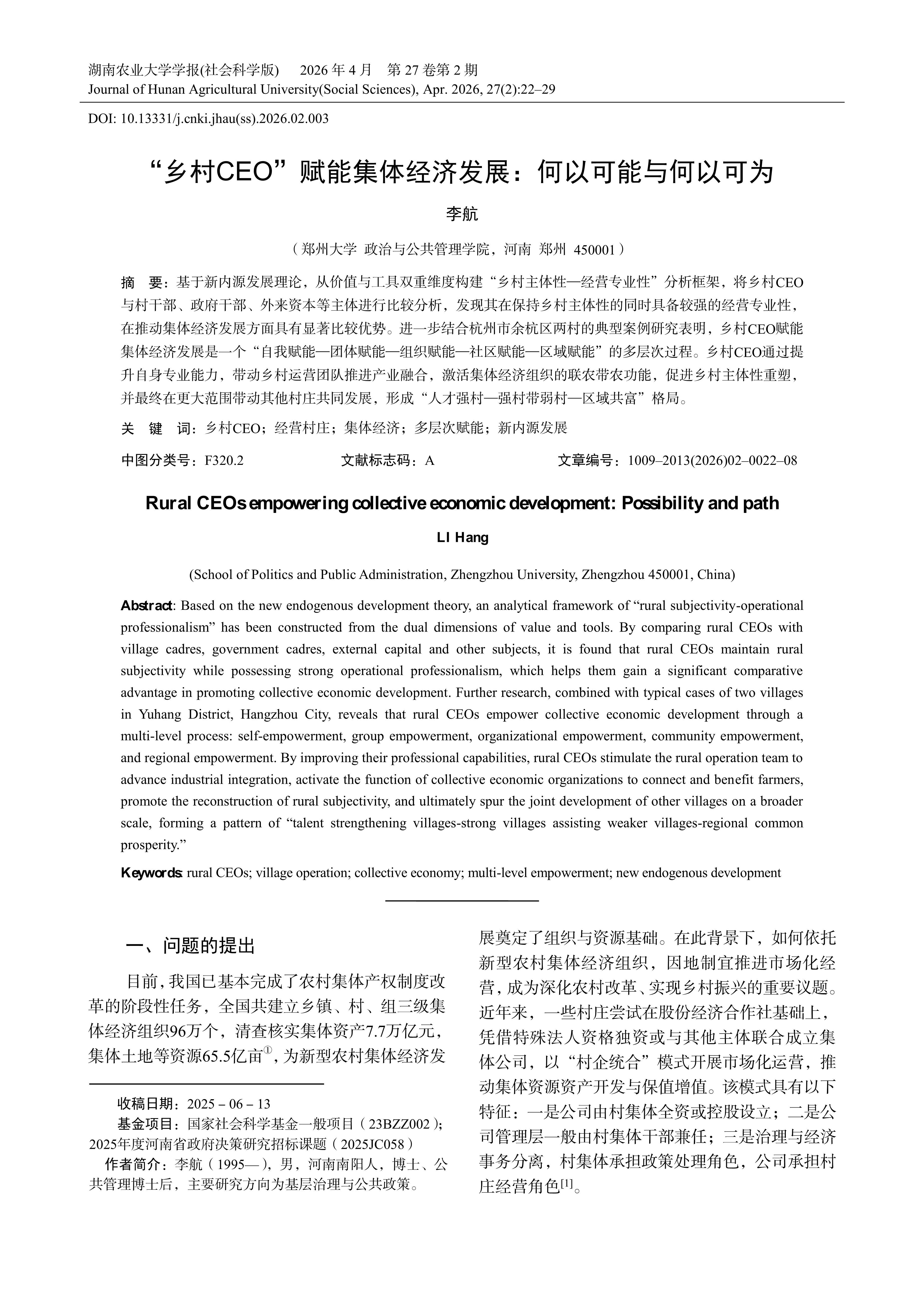 基于新内源发展理论,从价值与工具双重维度构建“乡村主体性—经营专业性”分析框架,将乡村CEO与村干部、政府干部、外来资本等主体进行比较分析,发现其在保持乡村主体性的同时具备较强的经营专业性,在推动集体经济发展方面具有显著比较优势。进一步结合杭州市余杭区两村的典型案例研究表明,乡村CEO赋能集体经济发展是一个“自我赋能—团体赋能—组织赋能—社区赋能—区域赋能”的多层次过程。乡村CEO通过提升自身专业能力,带动乡村运营团队推进产业融合,激活集体经济组织的联农带农功能,促进乡村主体性重塑,并最终在更大范围带动其他村庄共同发展,形成“人才强村—强村带弱村—区域共富”格局。