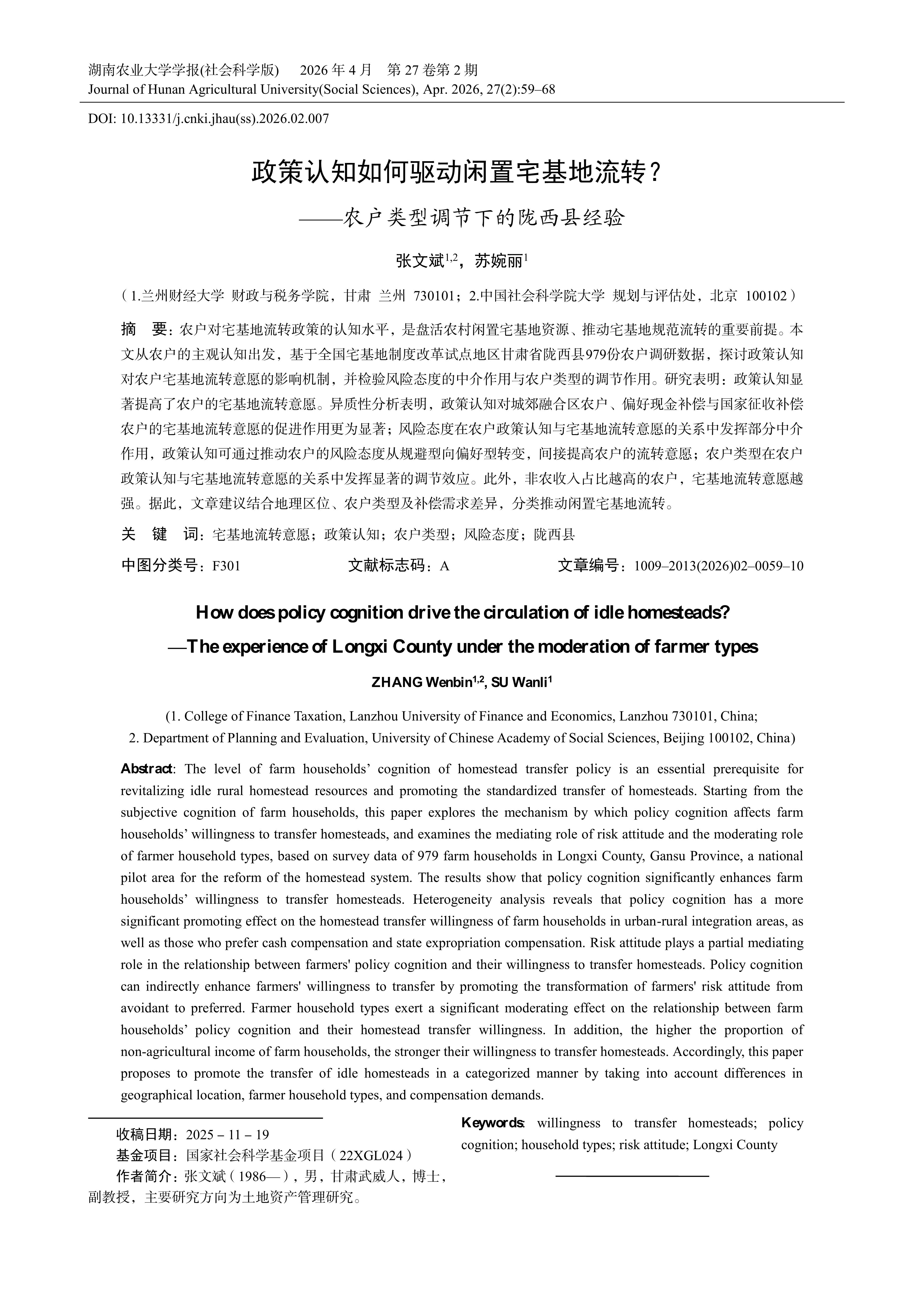 农户对宅基地流转政策的认知水平,是盘活农村闲置宅基地资源、推动宅基地规范流转的重要前提。本文从农户的主观认知出发,基于全国宅基地制度改革试点地区甘肃省陇西县979份农户调研数据,探讨政策认知对农户宅基地流转意愿的影响机制,并检验风险态度的中介作用与农户类型的调节作用。研究表明:政策认知显著提高了农户的宅基地流转意愿。异质性分析表明,政策认知对城郊融合区农户、偏好现金补偿与国家征收补偿农户的宅基地流转意愿的促进作用更为显著;风险态度在农户政策认知与宅基地流转意愿的关系中发挥部分中介作用,政策认知可通过推动农户的风险态度从规避型向偏好型转变,间接提高农户的流转意愿;农户类型在农户政策认知与宅基地流转意愿的关系中发挥显著的调节效应。此外,非农收入占比越高的农户,宅基地流转意愿越强。据此,文章建议结合地理区位、农户类型及补偿需求差异,分类推动闲置宅基地流转。