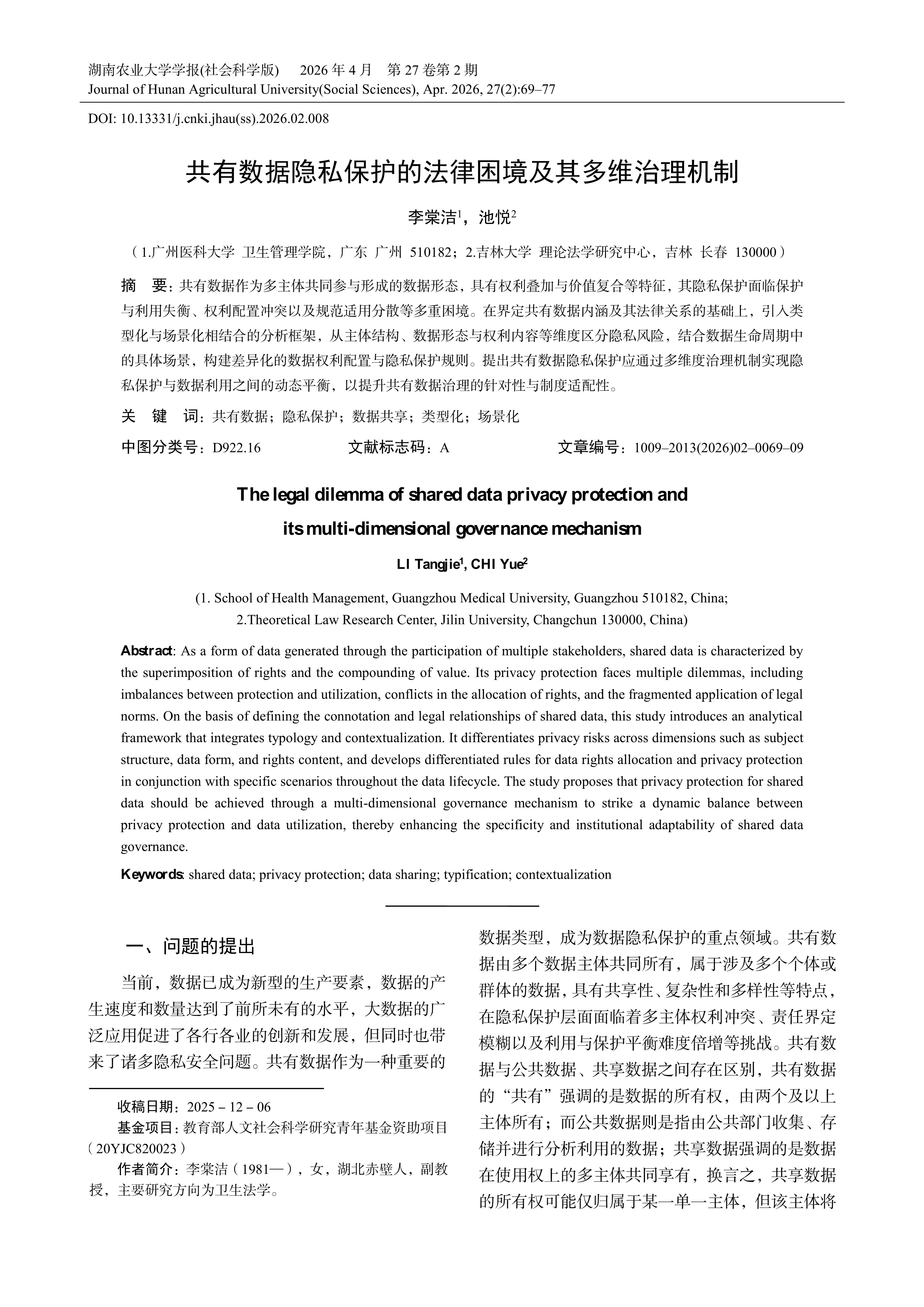共有数据作为多主体共同参与形成的数据形态,具有权利叠加与价值复合等特征,其隐私保护面临保护与利用失衡、权利配置冲突以及规范适用分散等多重困境。在界定共有数据内涵及其法律关系的基础上,引入类型化与场景化相结合的分析框架,从主体结构、数据形态与权利内容等维度区分隐私风险,结合数据生命周期中的具体场景,构建差异化的数据权利配置与隐私保护规则。提出共有数据隐私保护应通过多维度治理机制实现隐私保护与数据利用之间的动态平衡,以提升共有数据治理的针对性与制度适配性。