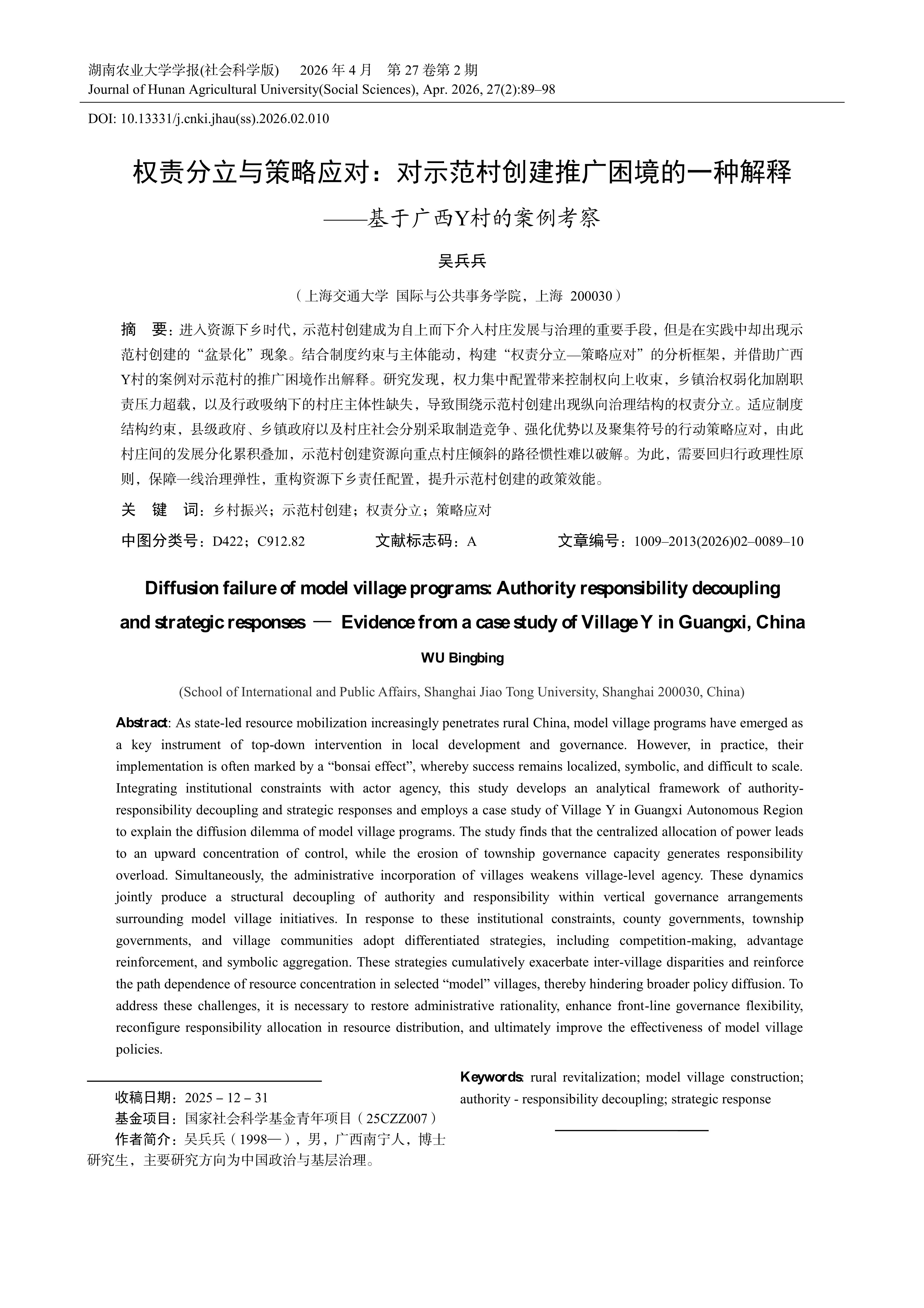 As state-led resource mobilization increasingly penetrates rural China, model village programs have emerged as a key instrument of top-down intervention in local development and governance. However, in practice, their implementation is often marked by a “bonsai effect”, whereby success remains localized, symbolic, and difficult to scale. Integrating institutional constraints with actor agency, this study develops an analytical framework of authority- responsibility decoupling and strategic responses and employs a case study of Village Y in Guangxi Autonomous Region to explain the diffusion dilemma of model village programs. The study finds that the centralized allocation of power leads to an upward concentration of control, while the erosion of township governance capacity generates responsibility overload. Simultaneously, the administrative incorporation of villages weakens village-level agency. These dynamics jointly produce a structural decoupling of authority and responsibility within vertical governance arrangements surrounding model village initiatives. In response to these institutional constraints, county governments, township governments, and village communities adopt differentiated strategies, including competition-making, advantage reinforcement, and symbolic aggregation. These strategies cumulatively exacerbate inter-village disparities and reinforce the path dependence of resource concentration in selected “model” villages, thereby hindering broader policy diffusion. To address these challenges, it is necessary to restore administrative rationality, enhance front-line governance flexibility, reconfigure responsibility allocation in resource distribution, and ultimately improve the effectiveness of model village policies.